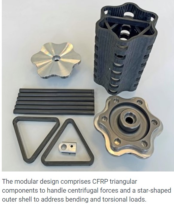 圖片注:模塊化設(shè)計包括 CFRP 三角形處理離心力的組件和星形外殼可承受彎曲和扭轉(zhuǎn)載荷。